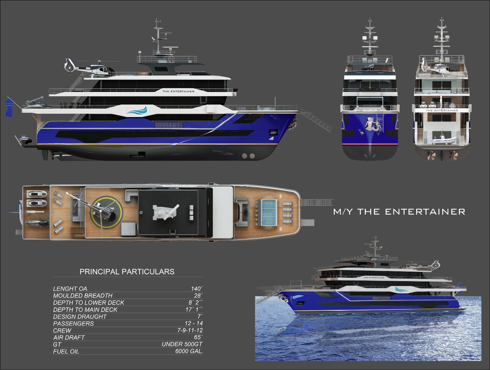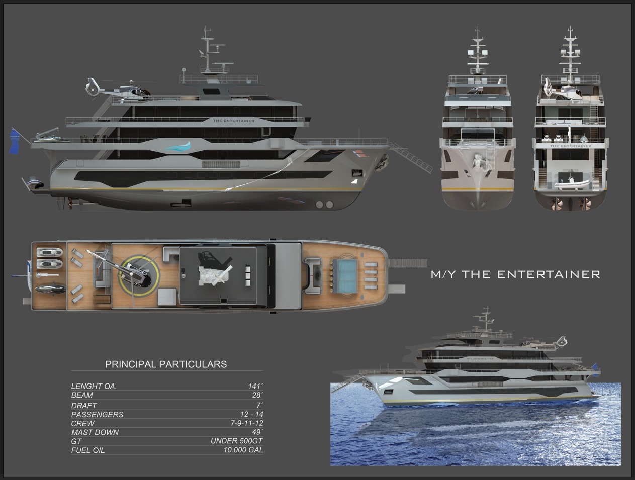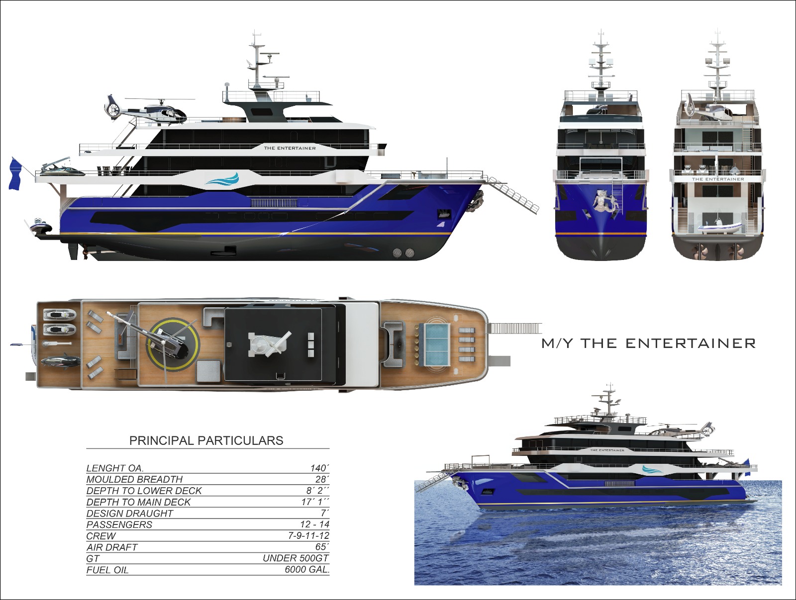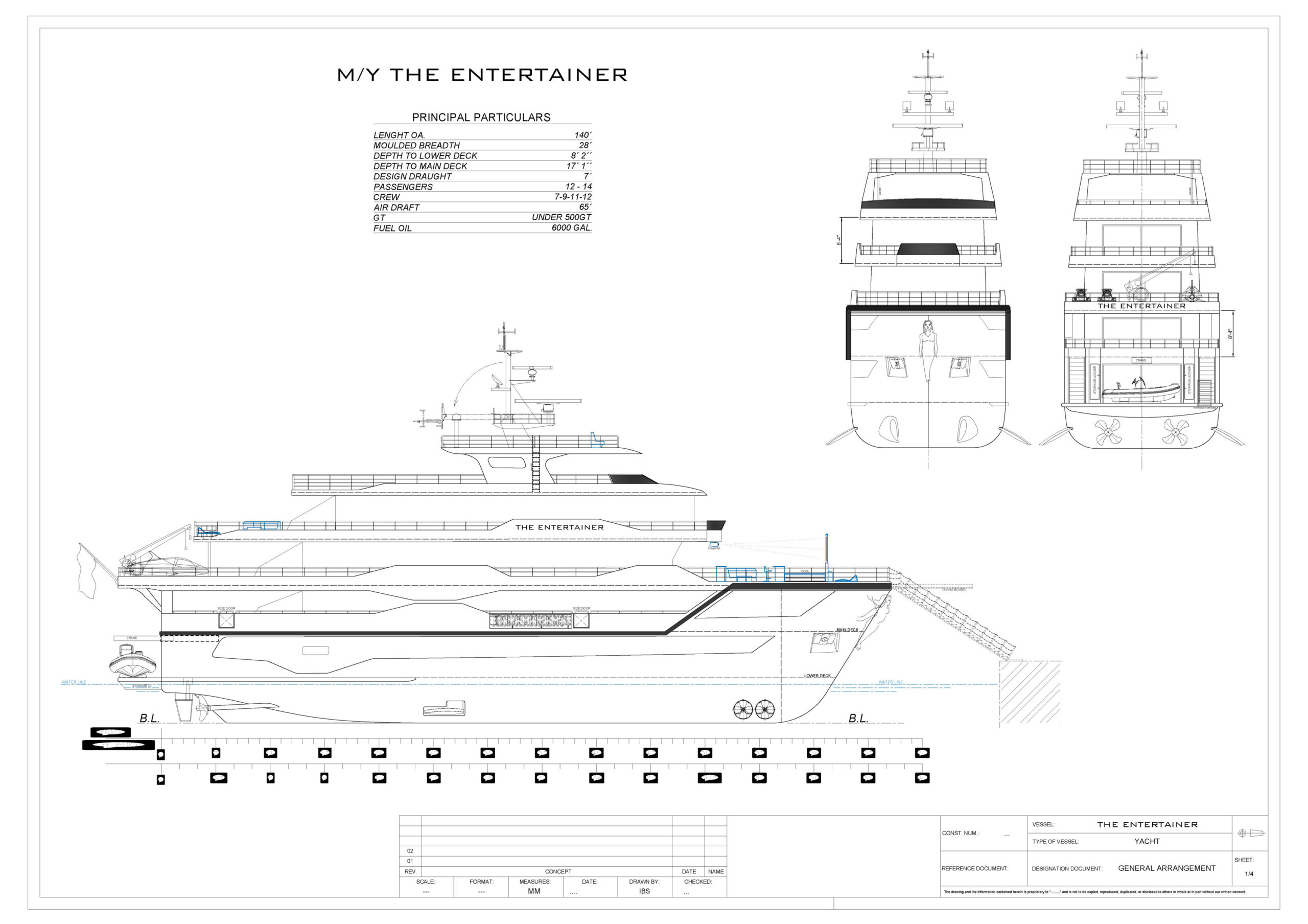 • The Entertainer yacht is a 141-foot, under 500 GT vessel designed for passenger and crew accommodation, with a length overall of 140 feet, beam of 28 feet, and a draft of approximately 7 feet.