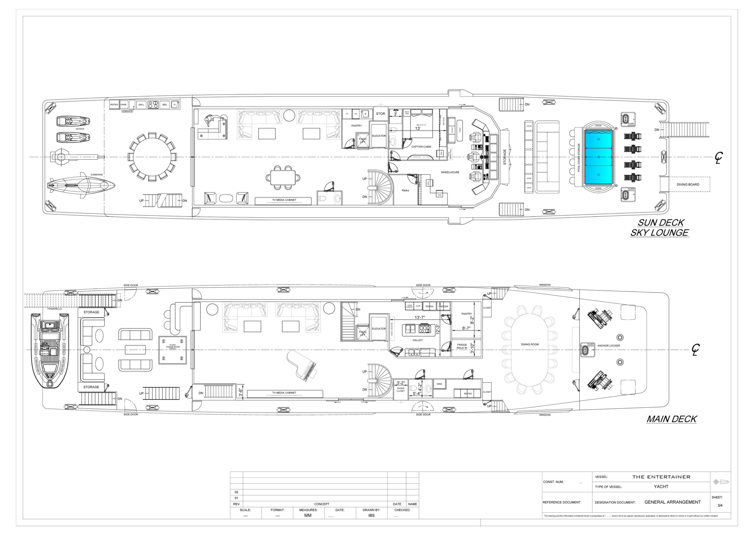 Great flow for guests and for crew to serve with ample storage to keep the vessel well organized. Attention to Rain and wash downs outdoor water proof covers and design so no water gets on or under cushions. Air craft carrier bow for Unique style, look and volume with mermaid ships figure on bow. Retractable stair case and diving board coming out of the bow, pool, elevator, Dum waiter, formal bow dining room with floor to ceiling windows. The 3rd level Flybridge is extened as far out as the swim platform adding a additional 10 feet where the Jet skis, Tender or what ever you want or don’t want up their maybe lounge chairs.